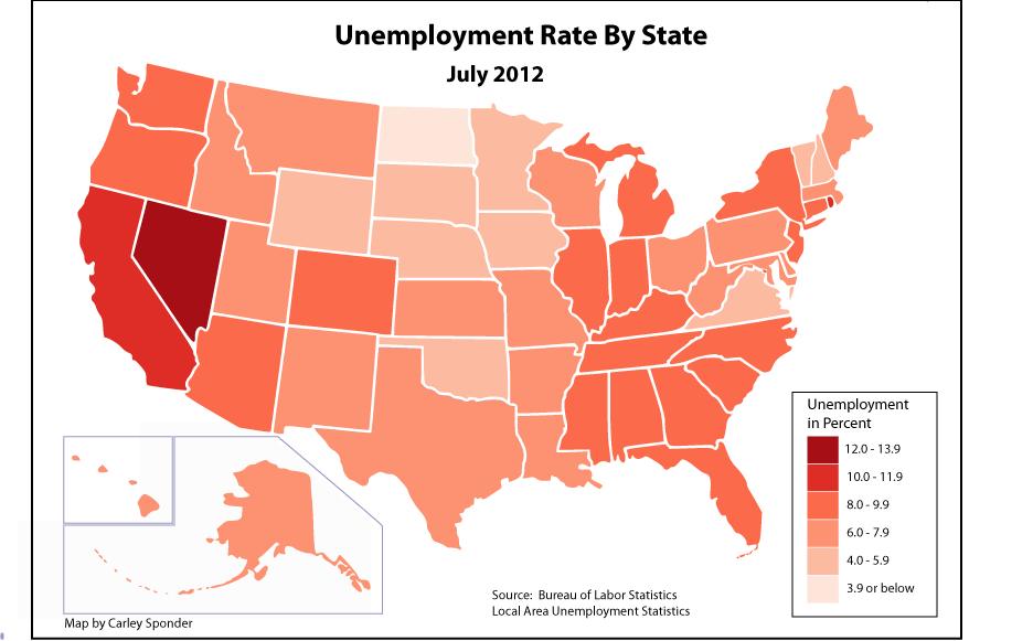 Here’s a nice example of a choropleth map showing the unemployment rate by state in 2012.