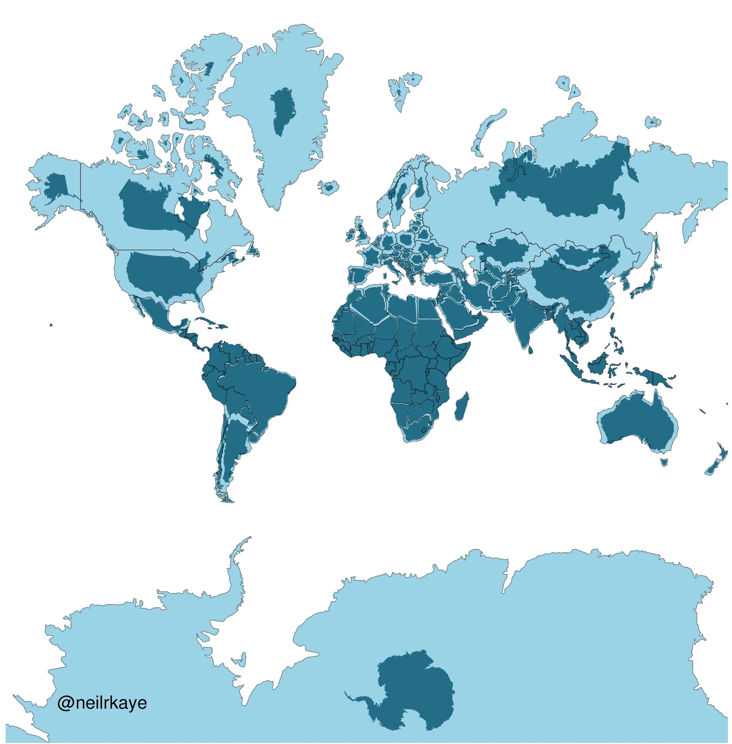 See the image below, the light blue is how countries appear on the Mercator projection, with the dark blue representing their accurate sizes. If your mind is blown with the true size of Greenland or Antarctica don’t worry, you’re not alone.